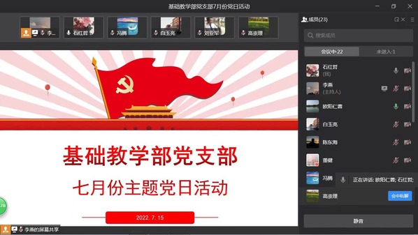 2022年7月15日,基础教学部党支部组织开展了以“数字经济助力教育新发展”为主题的学习活动,会议由支部副书记石红哲同志主持,支部22名党员参加了会议。