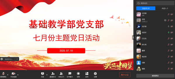 2025年7月10日,基础教学部党支部组织召开7月份主题党日线上学习活动,本次学习主题持续推进深入贯彻中央八项规定精神学习教育。会议由支部书记刘庆根同志主持,支部全体党员参加。