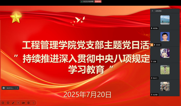 2025年7月20日下午15:30,工程管理学院党支部组织开展7月主题党日活动,本次活动采用线上会议的形式开展,主题为“持续推进深入贯彻中央八项规定精神学习教育”,由党支部书记冯均州主持,学院全体党员教师积极参与。
